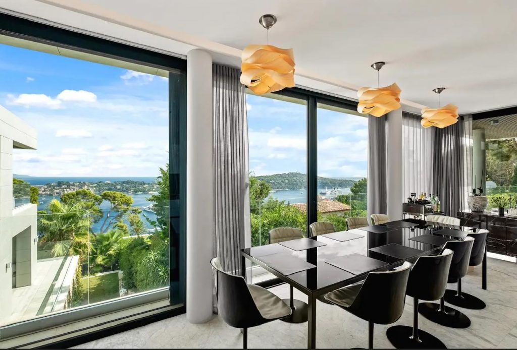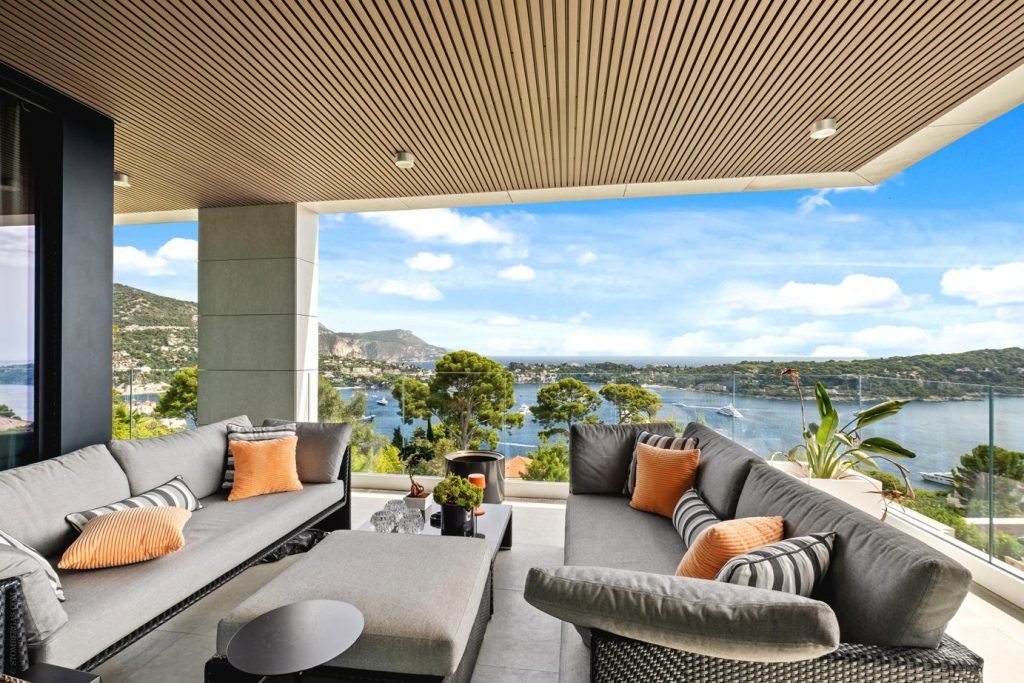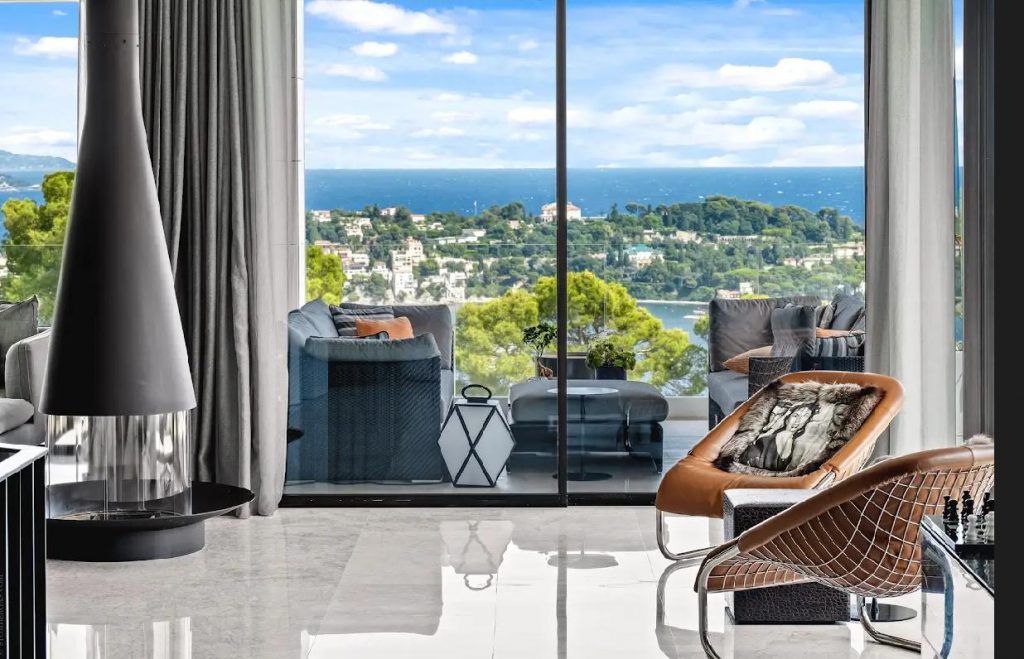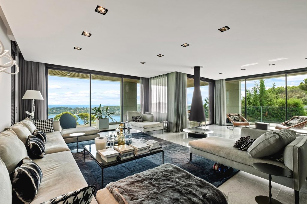The entrance hall leads into a large living room featuring a centrally located 360° fireplace and huge panoramic windows are opening onto a wraparound terrace.