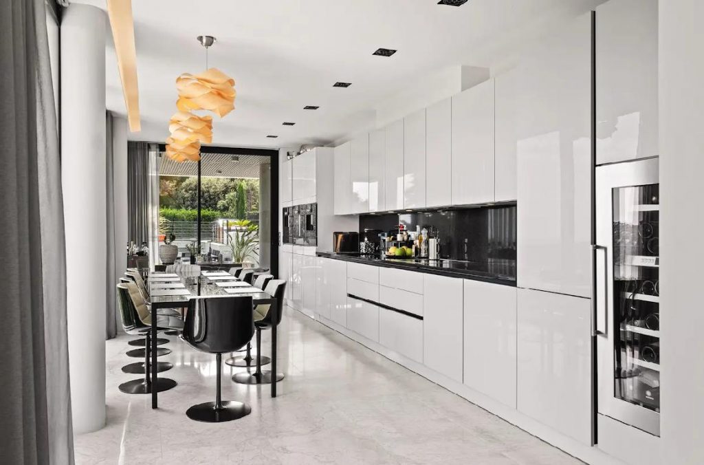The fully equipped kitchen, opens onto a covered dining terrace from where guests can also enjoys the magnificent views.
